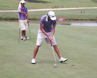 Chad Cox sinks yet another putt to make par on the 18th hole as Zachary Bauchou watches.