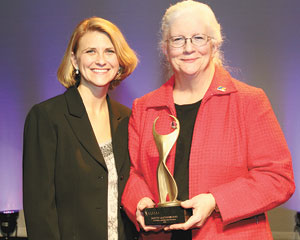 Dottie Leatherwood of the Cleveland County Healthcare System (right) with Chamber Chair Shannon Kennedy. Dottie received the Athena Award.