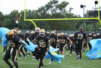 Local high school football once again dominates Friday nights throughout Cleveland and surrounding counties. Shown here, Shelby High School comes on the field to engage in yet another game. Friday night is football fever night!           - M. A. Andrews