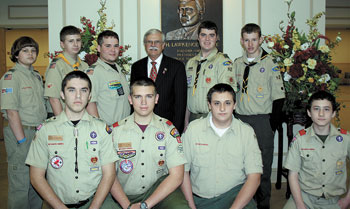 The annual City/Boy Scout Day in Kings Mountain hosted nine Boy Scouts, including two Eagle Scouts, from the Battleground District. The event allowed the Scouts to “shadow” various governmental administrative jobs on a “one on one” basis and see the activities and responsibilities of each department. Each scout teamed up with city departments and had the opportunity to get a great civic lesson. Mayor, Rick Murphrey said this is a “great opportunity and a life long lesson” for the boys. Front row (l to r): Paul Pillado, John Bridges, Alex Hannon, and Randall Trahan. Back row: Eddie Grabert, Garret Allen, Sean Downey, Mayor Rick Murphrey, Ross Clark, and Hunter Cooke. The event took place on February 10th.