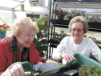 Bruno leads activities in the greenhouse that include planting seeds for the spring garden, watering plants, potting cuttings and reminiscing about gardens past.