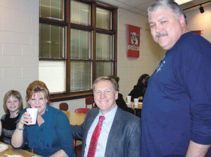 Polkville Fire Department held their annual fund raiser at the Union Elementary School cafeteria, Sunday, March 6th. The rain didn’t dampen the turnout for one of the best dinners served in Cleveland County, as well over 1500 dinners were served. The event started forty-eight years ago when a member of the department and a turkey farmer suggested hosting a dinner as a fund raiser. Funds from the feast will help with the completion of the new five bay firehouse currently being built in the town. The new firehouse will also feature sleeping quarters, a community/training room and offices. Also incorporated into the design will be a facial touch of the old Polkville High School building. Pictured above Polkville Fire Chief, Jerry Silver makes sure that Alexis, Marla and Mark Patterson were enjoying their meal. Mark is the head of The Patterson Design Group and is the architect of the new facility. The Polkville Volunteer Fire Department currently has thirty-seven volunteer firemen.