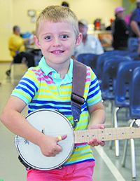 Four-year-old Colton Robbins, poses for a photo with his banjo at the 2nd Annual Dan Padgett Jamboree. Colton just started taking lessons from Dan.